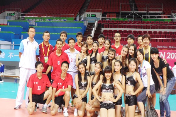 男排与我校在深圳体育馆工作的人员合影