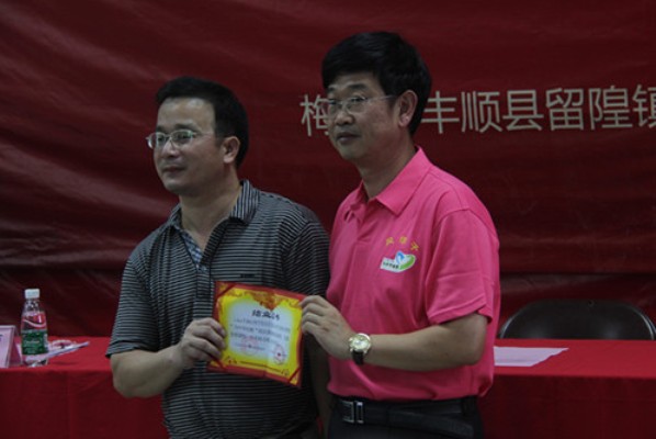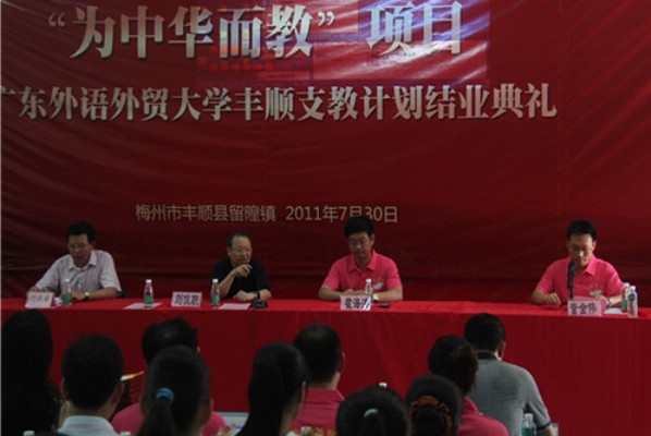 本网讯 7月30日下午,“为中华而教”项目——广外丰顺英语教师培训班、英语夏令营结业典礼在梅州市丰顺县留隍镇球山中学举行。丰顺县教育局“为中华而教”办公室主任刘仪职、丰顺县留隍镇球山中学校长叶织南、我校英语教育学院院长霍海洪等相关领导老师