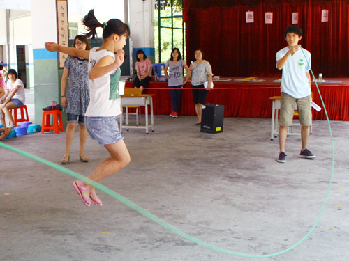 本次运动会共设五个竞赛性和参与性都很强的项目,即跳大绳、传递呼啦圈、趣味折返跑、力量拔河和瞎子签到。在此次比赛的总裁判罗瑞文同学宣布了有关安全及规则方面的注意事项之后,比赛在孩子们的一阵欢呼声中开始了。