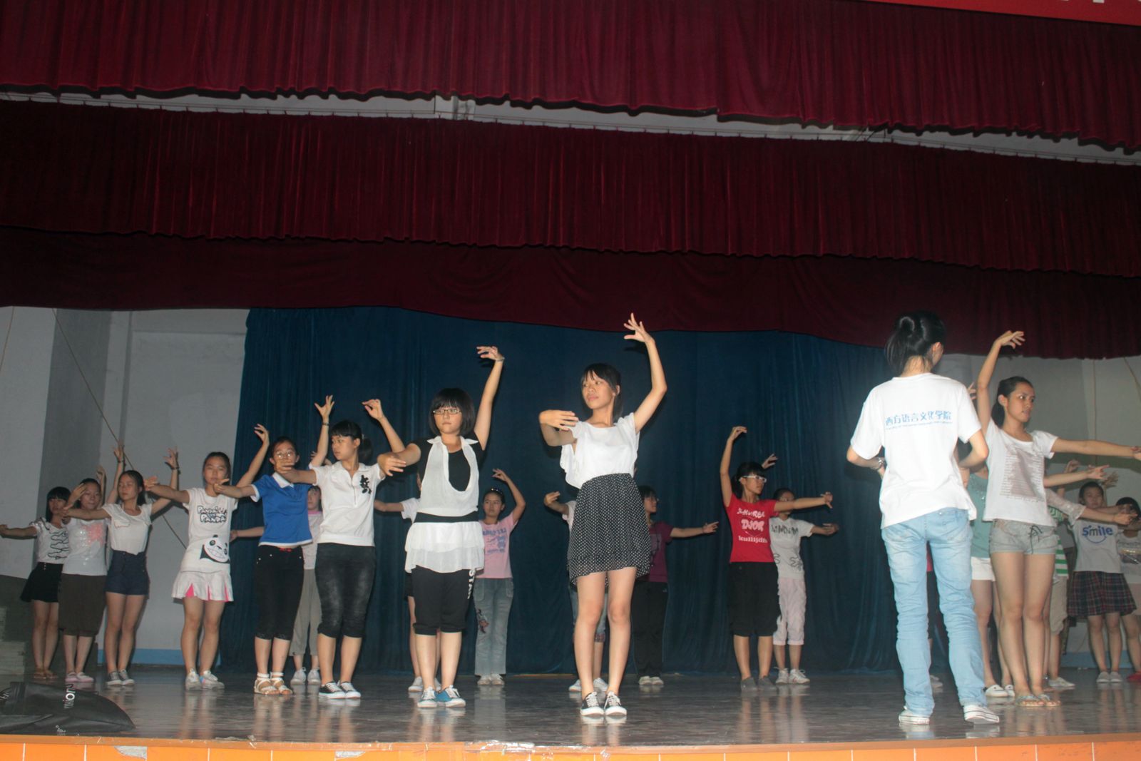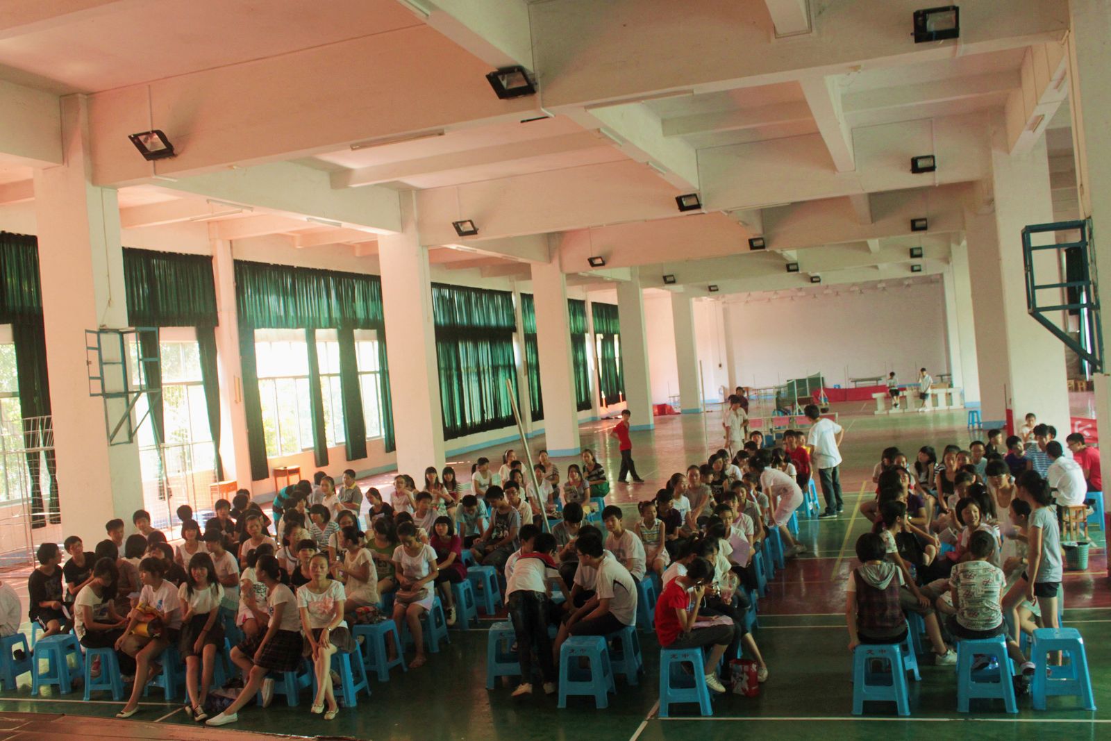 本网讯 2011年7月28日,按照原定计划,上午进行文艺汇演彩排,下午两点半正式开始演出。不过光是上午彩排就已经闹得人仰马翻了,幸好队员们和学生们通力合作,共同解决了一切问题,这也为下午文艺汇演的顺利演出奠定了基础。 上午的文艺汇演彩排,师生们九点半准时到达会场。由于会场没有风扇,空气不太流通,比较闷热,学生们都纷纷抱怨,有点小情绪。VISION队长林格好要求大家安静,“我们明天就要走了,我希望大家能够克服困难,安静坐在闷热的会场中,做个文明观众,给老师们留下最美好的印象。谢谢大家!”顿时,台下鸦雀无声,大家都静静地等待彩排开始。