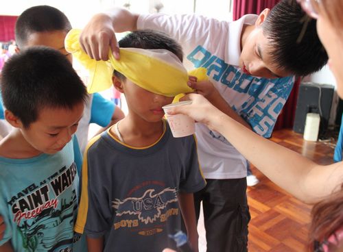 趣味性最大的要数瞎子敲锣,参赛者被要求蒙着双眼原地转2圈后,在队友的提示下走到目标位置敲锣。由于道具原因,本次比赛中使用的锣均以鼓代替。比赛过程中不时爆发出阵阵笑声。有经验的选手,比赛前已预先熟悉路线,待老师一声令下,便以飞一般的速度直冲目标位置,只听“嘭”的一声,仅仅用了9秒的时间便完成游戏。另一些选手却没有那么顺利,由于紧张一直走错了方向,越来越偏离鼓的位置,急得队员们直跳脚,连旁边的裁判员也忍俊不禁。