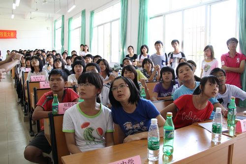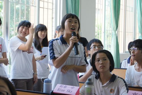 本网讯 7月27日下午,“Shine your talent,shine your dream”英语综合技能大赛在阳春一中阶梯教室举行,比赛在阳春地区7所中学的5支初中代表队和4支高中代表队之间展开。出席本次大赛的嘉宾有阳春一中邹红书记、陈旦老师、梁金风老师、吴华丽老师,广东外语外贸大学国际商务英语学院暑期夏令营总队长叶馥馥,阳春总队长兼Sunkids队长招少欣,Blue Sky队长苏家权。他们与阳春一中参加夏令营的同学们一同见证了这场激烈的角逐。