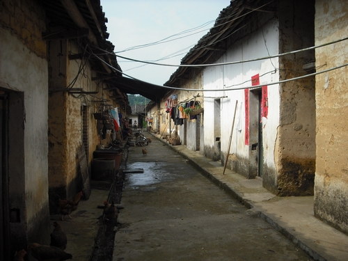 是夕阳映照下的古老村庄。