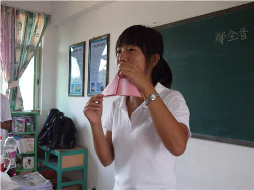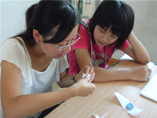 本网讯 7月25日下午两点半,英语教育学院梅州“风信子”队的留隍小学英语夏令营里开展了一节十分有趣的手工课堂。