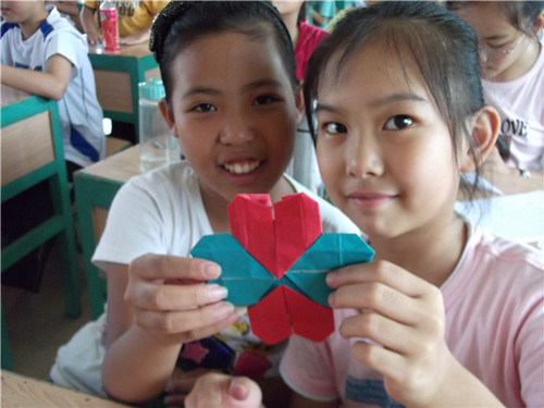 本节手工制作课从我们夏令营老师精心制作的手工折纸作品的展示开始,主要作品有鸽子、狐狸、郁金香、叶子、四叶草以及九重葛等。一件件精美的折纸作品引来了小学生们的阵阵欢呼。为增强学生们的学习热情,我们让学生自己从我们的作品中挑选出他们最想学的作品。