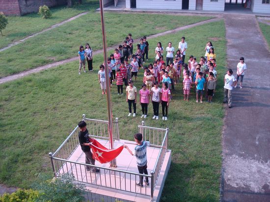校门打开,迎来一群精力充沛的孩子,我们一天的工作也随之开展起来。这是开学来第一个周一,我们首次进行升旗仪式。为了今天的升旗,我们特地挑选了木棉班几个高大的学生进行特别训练,教他们如何护旗和升旗。由于时间比较紧迫,升旗手们显然还不能熟练掌握,在国歌播完好一会儿之后红旗才升上旗杆的顶点。尽管如此,台下的氛围还是保持着一片肃穆,这让我们这群老师们深感欣慰。听说雅陶小学只在大型活动中才举行升旗仪式并且没有专门的训练而使仪式显得过于简陋,我们希望能带动这里的师生,将周一升旗的习惯不断延续下去,因此才这么精心地去训练升旗手并举行升旗仪式。