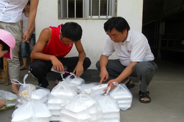 在之前的探访中,董婷已经了解到思源的吃饭问题一直得不到很好的解决,她向另外两位领导也阐述了这个问题。队员们反映实验中学附近的物价水平与大学城有明显差距,饭菜价格普遍较高。队员还一致表示“男生们基本都吃不饱。”曾志鹏建议把女同学吃不完饭的饭分给男同学,而姜灵敏笑着替队员们解释道:“男生吃不饱,女生刚刚好。”这时外出拿饭的队员回来了,三位领导趁此更清楚地了解队员们的伙食状况。“这个米还是很好的,很细,不过份量真的不够。”曾志鹏打开一盒盒饭后描述道。随后他们多次建议队员们“多要几个饭,不要挨饿”,要注意饮食营养。临走前,曾志鹏还对队员们说:“要搞好教学,做好工作,更要注意身体,注意安全。”