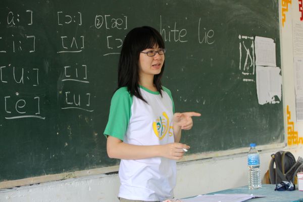 首先,她让同学们把桌子移到两边,在课室中间坐成一圈,同学们看到老师靠近来,都显得很兴奋。由于同学们没有系统地学习过音标,在唱歌前霍紫筠先教同学们学习音标。同学们学习热情高涨,只需10分钟左右,便已掌握几个单元音的读法。
