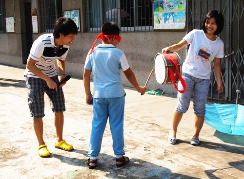 紧张的乒乓球传递后,各班的加油打气声还未平息,更富趣味性的“瞎子敲锣”紧接着开始了。“瞎子敲锣”的游戏规则是:每班各派5名同学,蒙着眼睛依次走到拿鼓的老师前,转3圈后用手上的棍子敲鼓,敲中之后返回,把棍子传给下一名同学。