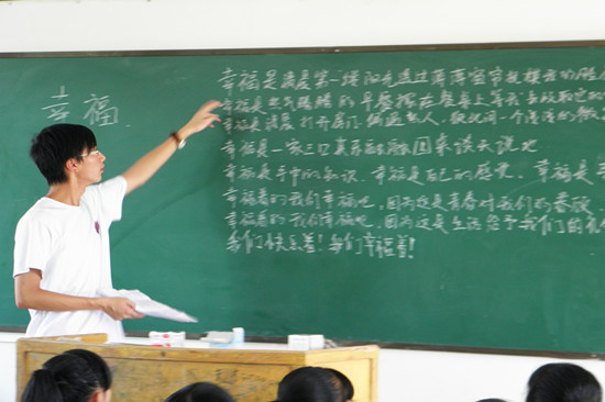 讨论结束之后,老师又鼓励学生大胆地站起来,与全班同学分享自己幸福的经历与对幸福的看法。有同学在分享时说到:“我的幸福就是以后可以环游世界,走遍世界每一个角落。”同学和在场的老师鼓起了掌。