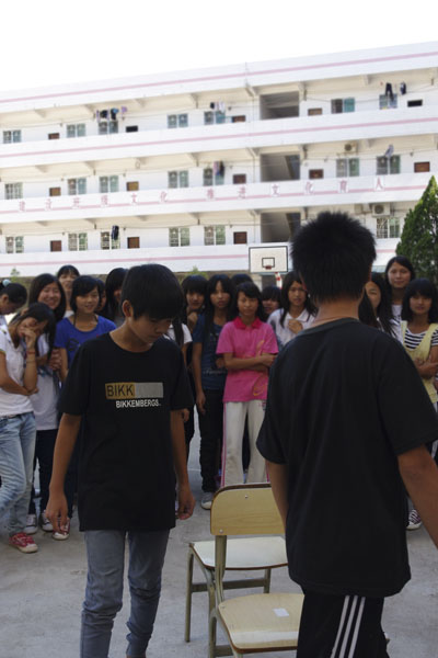 首先开始的是抢凳子比赛。每班需派出4名学生,两个班一组,8个人7张凳子,当音乐停时就抢凳子坐下,逐一淘汰参赛学生。这个比赛考验反应能力,学生都反应敏捷,比赛过程中无不紧盯凳子,音乐一停马上找寻凳子坐下。经过两轮比赛,4班荣获冠军。