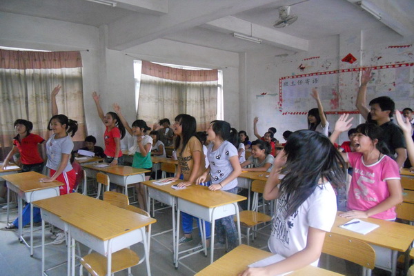 游戏紧张地进行着,有些学生还握紧了拳头,用心地听着。当拍卖到最后一个“真诚和勇敢”时,很多人都边举手边站了起来,异口同声地喊着“100万!”由于无法确定谁是第一个举手的,邵春瑜就问举手的同学中谁的第一志愿是“勇敢和真诚”的,大家又纷纷把手放下了,只留下最后一个穿着红衣服的同学还举着手,这个穿着红衣服的同学叫张冰敏,她说:“好紧张,手都抖了,感觉好像真的一样,幸好我坚持到了最后。”