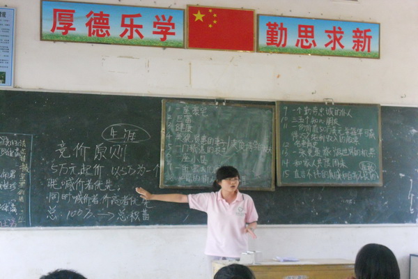 生涯拍卖会,竞价原则是5万元起价,先喊价者优先,同时喊价高者优先,每个人可以有100万的总积蓄,这100万的积蓄是竞价者一生的财富,拍卖物品有 “豪宅”、“图书馆”、“健康”、 “真诚和勇敢”、“三五个知心朋友”等。这是义教组的邵春瑜在学校上课时上过的一节课,她把它分享给茶洞中学的学生们。邵春瑜先在黑板上列出15个拍卖物,然后让大家把最想要的三个写在一张纸上,并按志愿排好顺序。