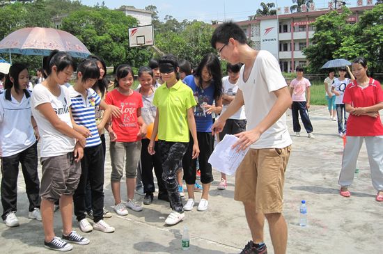 接下来的“瞎子敲锣”与“背球接力赛”更是异彩纷呈。在“瞎子敲锣”的比赛中,多数的参赛选手因为连续的原地旋转而迷失方向,难以敲到锣。5班的参赛选手则在这种情况下“异军突起”,凭借稳定的发挥一举夺魁。而“背球接力赛”则状况百出,有的参赛选手因为用力过猛而夹爆了比赛用的气球;有的则夹不稳,使气球随风而去。