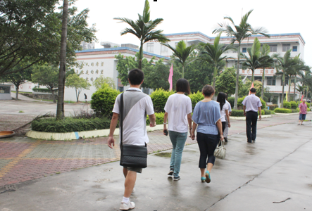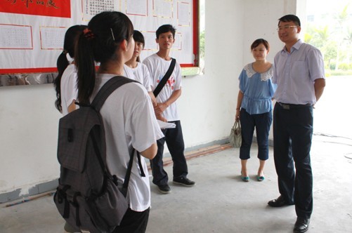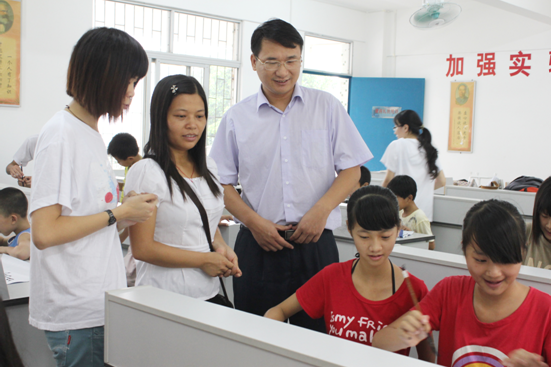 本网讯 7月22日,虽然烈日逼人,中文学院党委副书记李江、团委书记王秋萍依然在黎溪镇领导的陪同下来到了黎溪中学,探访在这里进行义教活动的队员们。