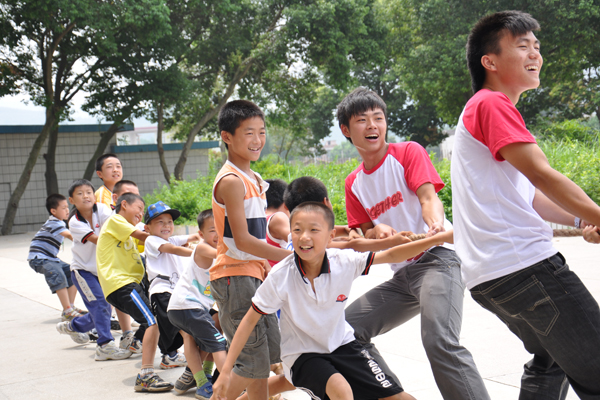 在改版的铁人三项——短跑、仰卧起坐和倒跳绳的比赛中,男生雄姿英发,女生巾帼不让须眉。而在心心相印背夹球项目中,虽然动作有点别扭,但是孩子们还是玩得不亦乐乎。最后,在一旁看着他们比赛的哥哥姐姐都激情洋溢,决定亲自上场,来一场拔河的压轴大戏。由于Together里仅有五个男生,经过内部决定由他们对阵10个女生。经过几天的相处,不少队员都有了自己的粉丝,“钱老大给力点”“美江姐姐,加油加油”……最后,果然是印证了人多力量大这一句,女生这边占领先地位,眼看哥哥这边要输了,小朋友干脆一拥而上。在Together队员和小孩子相融的笑声中,胜利已经显得不再重要。