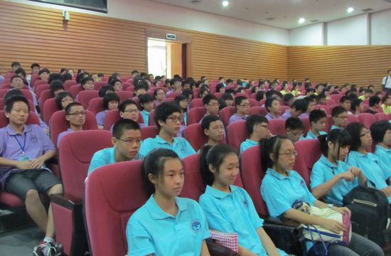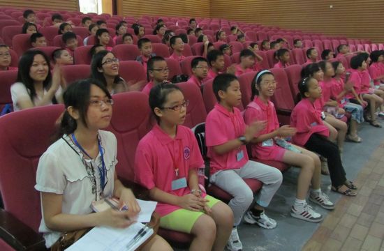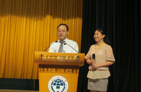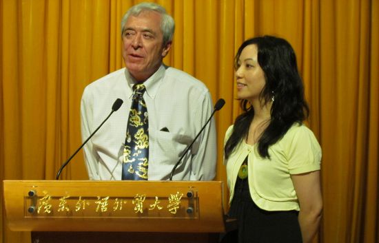 本网讯 7月14日上午, 2011年广东外语外贸大学快乐英语夏令营开营典礼在北校区六教学术报告厅举行。继续教育学院副院长陈开举教授、美国国际教育合作公司总裁John和副总裁陈艳、夏令营总协调丁龙、教学组组长刘文明和学工组组长莫振华出席了开营典礼。典礼由丁龙主持。
