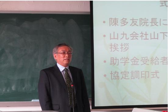 随后,山九株式会社的山下政博部长致辞。山下政博介绍了目前东京的一些情况,提到由于地震,在东京为节省资源,公司里都不开空调,因此白领们都不戴领带,而今天能戴上领带参加这个签约仪式,感到非常高兴。他还提到现在中日两国的关系友好,为此他表示非常感动。最后,山下政博鼓励学生要努力学习,创造一个美好的未来。