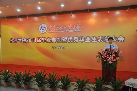 何勇斌寄语:做真正的广外人 公开学院院长何勇斌在致辞中以“怎样才能做一个真正的广外人”为切入点,用生动的例子、幽默的语言向大家提出了四点期望,即学习、不断完善自我;自信、找准人生的定位;自爱、积极对待人生;付出、学会服务于他人。最后,他寄语同学们在今后的生活中长存感恩之心,心系母校,关心母校发展,做真正的广外人。