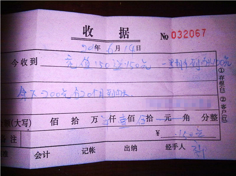 收据上面写着充值150送150和余下200元分20个月到账