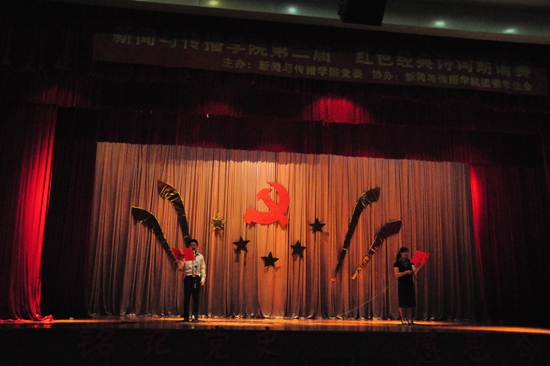 本网讯 6月15日晚,新闻学院第二届红色经典诗词朗诵赛在学生活动中心举行。出席本次比赛的领导嘉宾有校党委副书记金耀观、校党委宣传部部长胡文涛、新闻学院党委书记孔晓明、副书记陈华荣等。