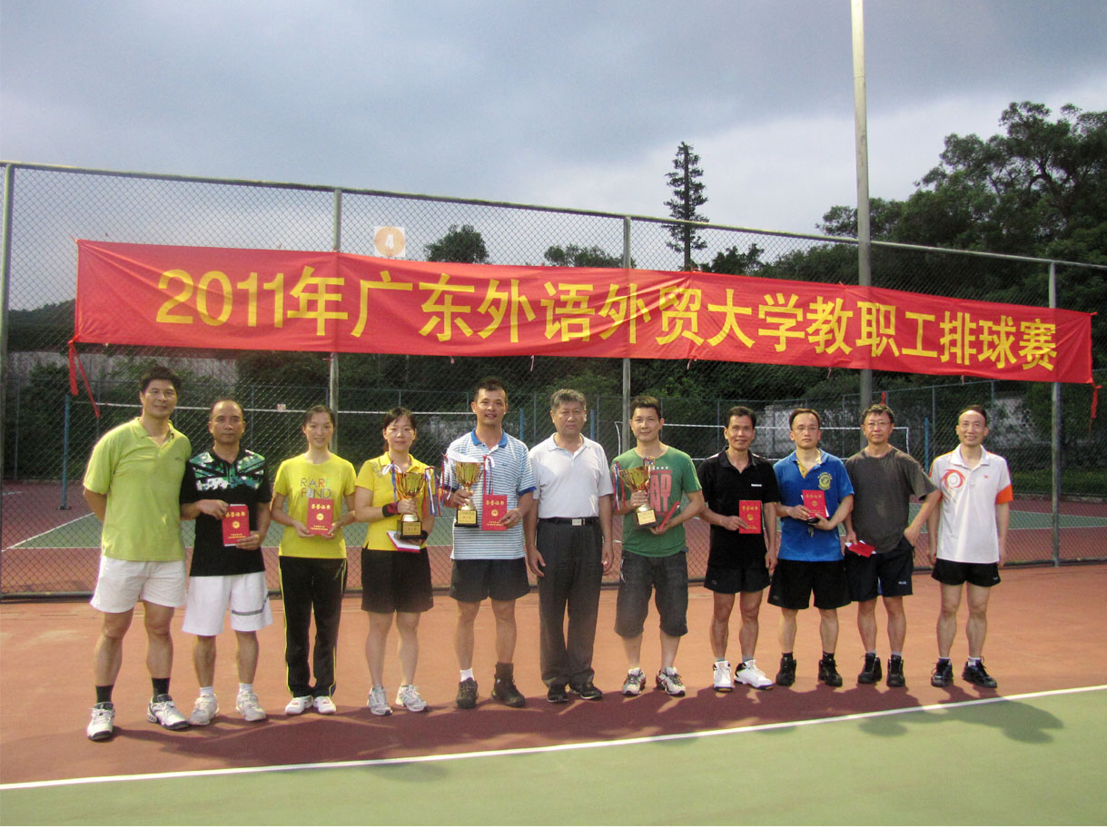 本网讯 6月11日下午,2011年广东外语外贸大学教职工排球赛圆满谢幕。体育部再拔头筹,公开学院、商英学院分别获得亚、季军。校工会常务副主席刘祎亲临现场为获奖队伍颁奖。