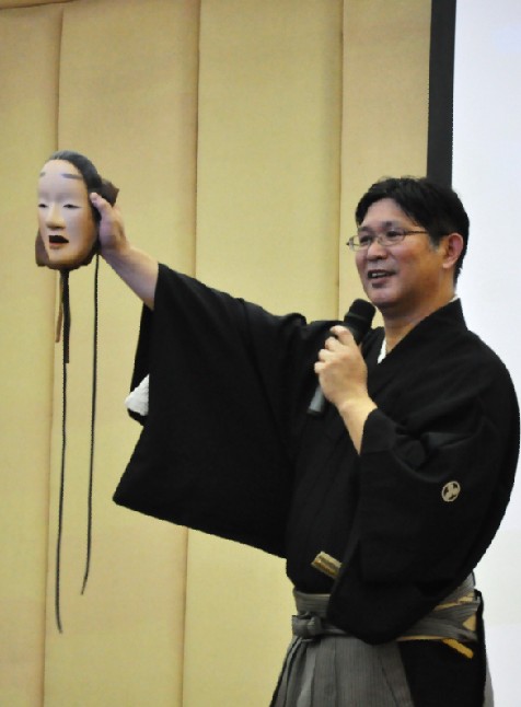 安田登身着深色日本传统和服走上讲台,面带笑容地问到“这次的讲座全部用日语进行,没问题吗?”讲座在轻松融洽的气氛中开始。首先,他介绍到“能”是起源于600多年前的日本传统表演形式,并向同学们展示了表演“能”所戴的面具——“能面”。为了让大家更近距离地观赏“能面”,他走下台缓缓绕场一周进行展示。
