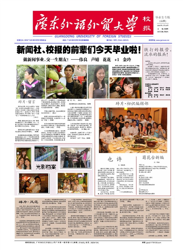 这份红底白字的“广东外语外贸大学校报”主题校报虽然形式上与正式的校报完全一样,可是那调侃、轻松的内容却暴露了它的不一样。报纸的右上角有着“山寨”字样,原来这是一份“鱼目混珠”的山寨版校报!