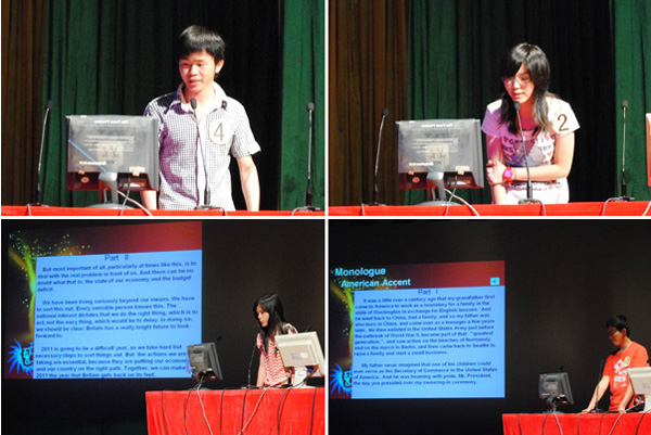 本次大赛由个人独白和电影配音两个环节组成。独白环节采用现场随机方式,从10级12个班里面每班随机抽取2名同学参赛。在随机抽取的过程中,台下的英文学子们无不神经绷紧,既兴奋又紧张。而被抽中的“幸运儿”则要登台朗读英音或者美音的语音素材,其中,英国首相新年致辞因其简单短小备受青睐。每个人凭精心准备的片段同台竞技,同学们或略显紧张,或从容淡定,渴望读出个人的风采,读出班级的水平。
