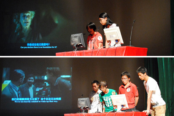 大赛进入紧张的配音环节,可谓是精彩不断,异彩纷呈,选手们不仅全神贯注,更有甚者配至精彩处手舞足蹈,表现出鲜明人物形象,感染着现场的观众们。5班A组《牛仔裤的夏天》的选手们生动形象地用美音为我们讲述了四个年轻女孩的珍贵友情,其流畅的语音和灿烂的笑脸无不与剧中人物的语音和表情相呼应,可谓是惟妙惟肖。12班A组《盗梦空间》的四位男生则以疾风骤雨般的语调和歇斯底里式的咆哮把紧张的气氛渲染得淋漓尽致,其中,男主角Cobb的配音选手刘鑫语气坚定,神情严肃,颇有大将于生死关头果断取舍的风采。《时尚女魔头》中女魔头上司Miranda刁钻无理、不近人情的形象在黄卉菁轻描淡写的语调中呼之欲出;6班B组选的是《野孩子》中学校法庭裁决Poppy的情节。赵茜的尖声尖气、咄咄逼人再现了Harriet的落井下石、盛气凌人和刻薄娇纵,张自楚则语气沉稳凝重,中气十足,将法官Mrs Kingsley的威严模仿得惟妙惟肖,情节最后在“打火机”的质疑声中戛然而止,更是悬疑重重。