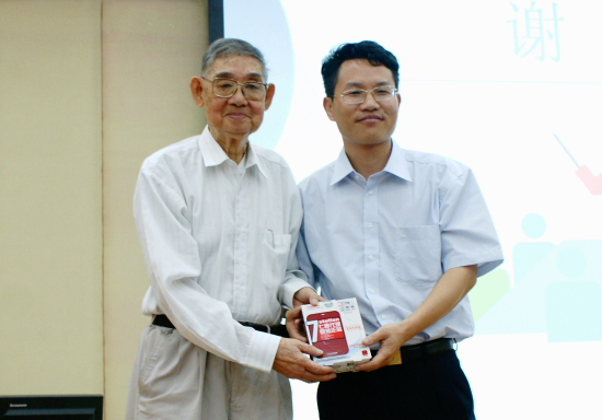 讲座气氛热烈,历两个半小时结束。研究生处副处长朱文忠致辞,他感谢桂诗春教授为年轻学子们带来一场精彩的讲座,同时也勉励学子们不断努力,不断超越。最后,伍方斐代表图书馆赠送桂诗春这位“荣誉图书馆员”一个“1TB”容量的移动硬盘。伍方斐笑称他送的不是“比特”而是“原子”,但是能装“比特”的“原子”。