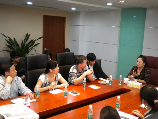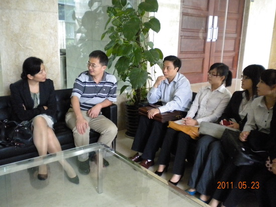 在短暂的车程之后,政管学院一行人到达了目的地广东省唯一一家合法的脐带血造血干细胞库。工作人员热情地接待了一行师生,在稍作休息之后我校师生便与企业总经理岚山女士进行了一次座谈。邵兵、余芳、毛国民与岚山深入沟通了有关合作与双方需求方面的问题,其间涉及了第五届公关技能大赛赛制赛程、往届情况等一系列问题。岚山表示很希望与我院合作,她风趣地讲道:有价值、有意义、资源合适、水到渠成,这样子的合作机会很难得,所以要大力支持。