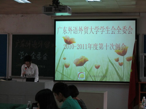 本网讯 5月21日下午,东方语言文化学院学生会承办了广东外语外贸大学全委会第十次例会,会议在北校一教420会议室举行。此次会议的主题为广东外语外贸大学红旗学生会第二轮评选。