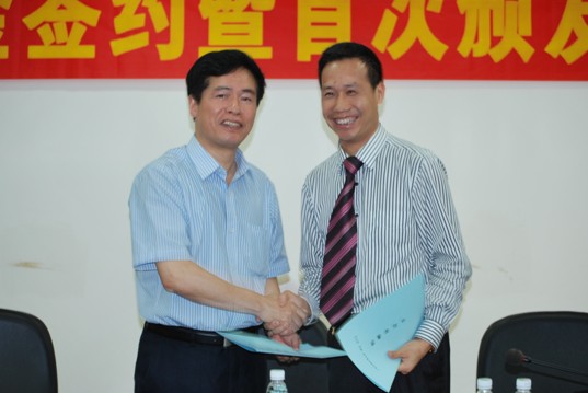 仪式的第二个环节是“律治”助学金捐赠协议书的签订与支票的捐赠仪式。首先,蔡镇顺代表我校法学院分别与朱列玉、杨择郡、黄添顺(由李栋律师代签)签订“律治”助学金捐赠协议书,随后接受了三大律师事务所捐赠的支票。