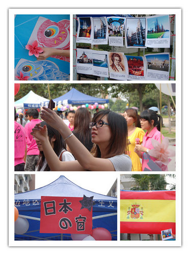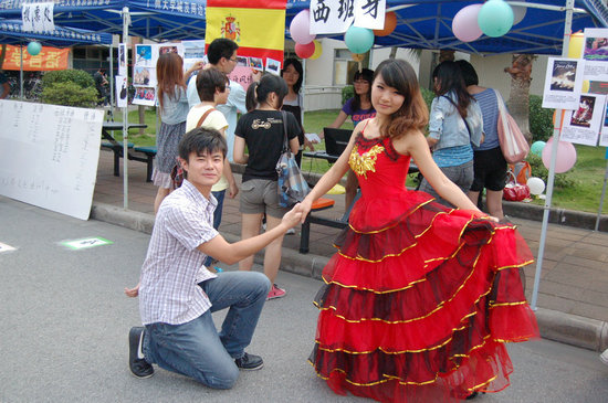 本网讯 “给你的同学写祝福语,我们免费寄送,还能现场教授小语种哦!”“投下你宝贵一票,西班牙美女即刻给你献舞一段喽!”5月19日下午,语言学习与跨文化培训中心“世界之窗地球村”游园会在南校区校道上如期举行,校道上弥漫着浓浓的异国情调。