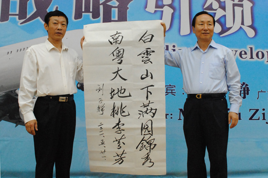 讲座前,在与会嘉宾的陪同下,刘子静挥毫泼墨,为我校题词:“白云山下,满园锦秀;南粤大地,桃李芬芳。”随后,许国彬向刘子静颁发客座教授聘书,石佑启向其颁发MBA教育指导委员会委员聘书。