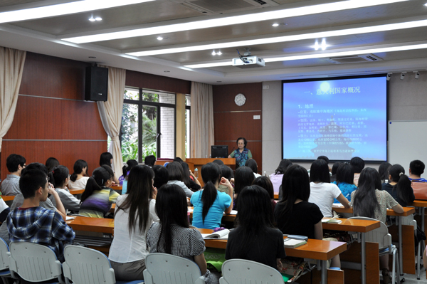 5月23日下午,广东外语外贸大学 “著名教授论坛”第152讲“经济视角下的意大利发展简史”系列讲座于北校第六教学楼召开,由张密教授主讲。人事处副处长谢文新、西语学院院长郑立华、西语学院党委书记方华及意大利语系全体师生出席。讲座由郑立华主持。 讲座前举行了简单而隆重的受聘仪式。张密受聘为我校客座教授,由方华为张密颁发聘用证书并向她赠送礼品。