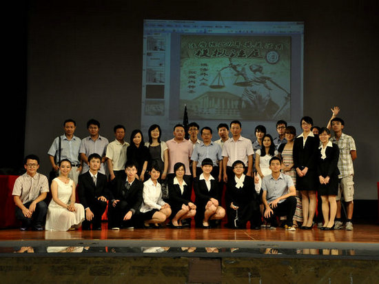 本网讯 5月18日晚,由校党委宣传部、法学院主办的校园精品文化活动模拟法庭在B8学术报告厅正式上演。广州万国司法考试培训机构校长方昌及其助理刘鑫作为嘉宾出席本次公演。校党委宣传部部长胡文涛、校党委宣传部杨冬生老师,法学院副院长黄丽萍、党委副书记卢海清、团委书记朱海龙、法学院梁晨老师以及各兄弟院校代表到场观看。
