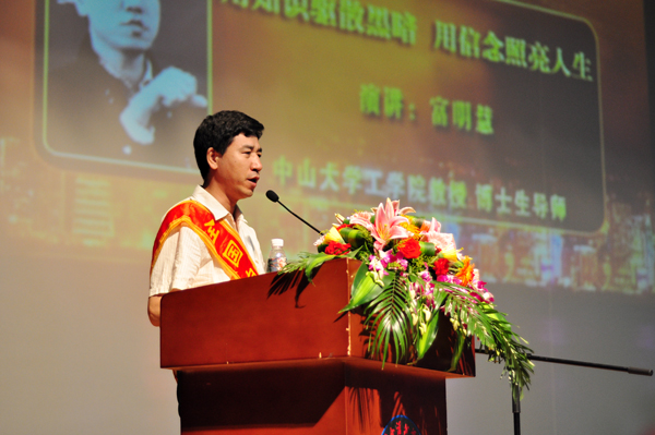 中山大学工学院教授、博士生导师富明慧也有一断难舍的“高校情”。从吉大本科毕业到莫斯科大学博士,再到清华大学博士后,这一路走来,对于患有遗传性视网膜色素变性眼病的富明慧来说,有着常人无法想象的艰辛。就在他终于站在中山大学的讲台上,成为一名大学教师时,等待他的却是双目完全失明的命运,人生陷入了低谷。在所有人看来,双目失明的他已经不可能承担起繁重的教学科研任务。富明慧回忆起来:“一想到要离开我热爱的讲台,离开学生,离开教育事业,我的心里就酸酸的,说不出的难受。”然而,富明慧没有轻易认输,而是开始积极寻找在黑暗中完成教学科研任务的途径。在先进的电脑语音软件技术的支持下,在家人、学生、领导、同事的帮助下,他逐渐摸索出了一套备课、授课、搞科研的方法。在失明后第三年,成功晋升为教授、博士生导师,盲人教师升教授在全国都实属罕见。学生上他的课,不仅钦佩他高超的教学水平,还感动于他自强不息的奋斗精神。