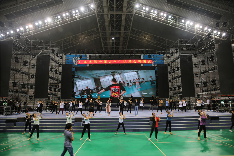 我校艺术学院副院长、开幕式总导演陈燕敏透露,目前所有节目都已定型,且已经进入灯光舞台合成的部分,将于在今明两天进行两场彩排。本次开幕式表演形式多样,既有将力量与美相结合的街舞、花式篮球、健美操表演,也有彰显校园文化,贴近大学生生活的青春表演唱,充分体现“团结、奋进、文明、育人”的大运会宗旨,彰显当代大学生体育活力、青春风采除此之外,本次开幕式汇演也融合了岭南文化,以水墨为载体,着力于描绘广东的山水建筑,展现岭南独特文化魅力和精神风貌。“这个节目将会为大家呈现出一幅山水画的感觉。”