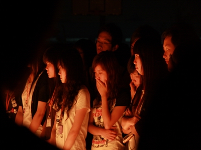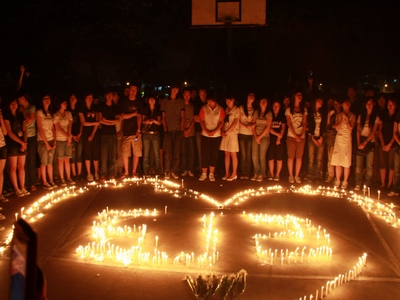本网讯 5月21日晚,是全国人民为悼念汶川遇难同胞默哀的最后一个晚上,我校公开学院学子用上千烛光为汶川同胞祈福。当晚8时,悼念活动还未正式开始,一支支蜡烛,一个个跳动的烛光已开始向活动地点流动。真诚的关怀、美好的祝福和无尽的心意都凝结在这闪闪的烛光之中,同学们安静地用蜡烛围成的心型,然后围成一圈默默地祈福……