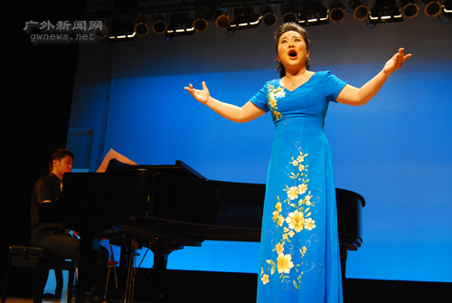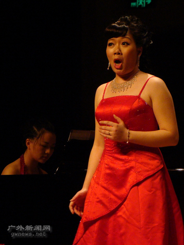 刘湘老师身着粉红与白色相间的礼服,一出场便赢得了阵阵掌声。她演唱了颇具地方特色的湖北民歌《峡江情歌》和湖南花鼓小调《洗菜心》,表现了两湖地区少女调皮、开朗的性格特征。