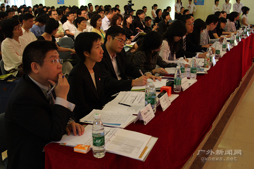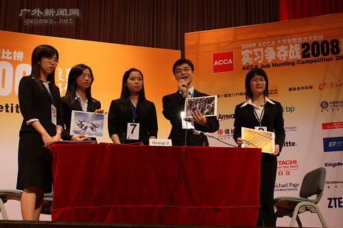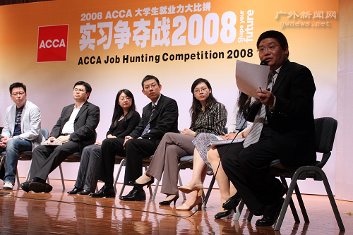 本网讯 5月24日下午,“2008ACCA大学生就业力大比拼实习争夺战”广东赛区决赛在广外大南校区学生活动中心举办。大赛邀请了安利人力资源总监饶俊、安永会计师事务所合伙人黄寅等12位重量级评委,广外大学生就业指导中心主任赵烨也出席了本次活动。