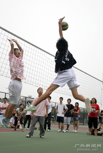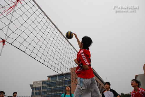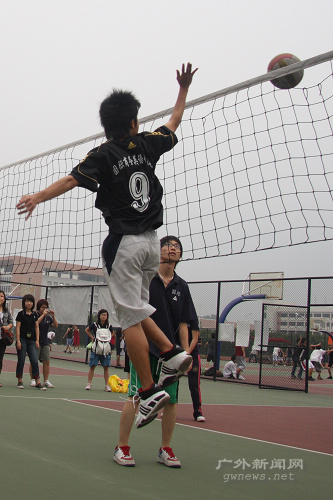第二局比赛双方拼抢得愈发激烈,比分也随之交替上升。管理学院拉拉队则列队站在场边高喊着“管理加油”的口号。在6:6之后,管理学院多点开花,轻吊、强扣、后排攻、发球得分使得他们将比分一下子拉大到15:8。面对法学院主攻手梁健辉的强攻,管院排出了双人拦网的战术,迫使对手频频扣球失误。管理以25:14轻松扳回一局。