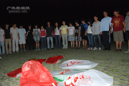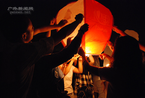 本网讯 5月13日晚,我校二饭门前的马路上气氛低沉,一群学生聚集在此。他们神色哀伤,说着四川方言,讨论着家乡的灾情。他们是广外的川渝学子,当晚自行组织放孔明灯为家乡祈福。