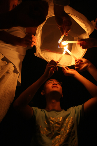 记者注意到,这些坚强的川渝学子们表情沉痛但没有流泪,传自家乡的噩耗没有把他们打倒。他们坚强地团结在一起,尽自己的努力为家乡做一些事情。他们手持蜡烛,传递着火种,点燃了孔明灯。