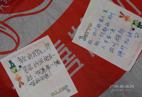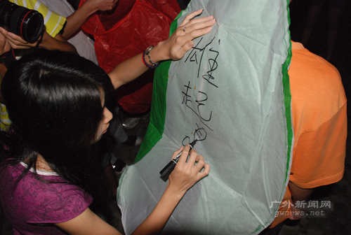 载满祝福的六只孔明灯徐徐升起,在夜空中构成美丽的画面。那承载着川渝学子们对家乡深深祝福的孔明灯,乘着风向高处飞去。同学们不约而同地呼喊着“四川雄起”、“中国加油”。