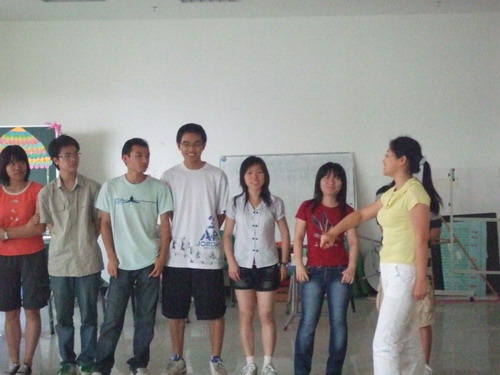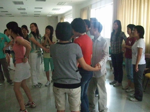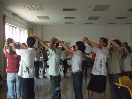 讨论、分享活动后,阎茹针对当前的大学生长时间对着电脑上网,会造成颈椎和肩膀的酸痛,还别出心裁让同学们玩起了按摩操。