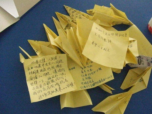 活动以写祝福语的形式开始。阎茹结合这几天牵动千千万万中国人心的四川地震事件,让同学在纸条上写下自己获悉灾情时的心情和对灾区人们的祝福,并当众宣读祝福语。小小的爱心飞机,承载的是同学们对灾区人民的深情厚谊。一位同学这样写道:“灾难无情,人间有情,愿灾区人们能挺过难关,中国人民都会支持你们的。爱的力量能聚沙成塔的,加油!