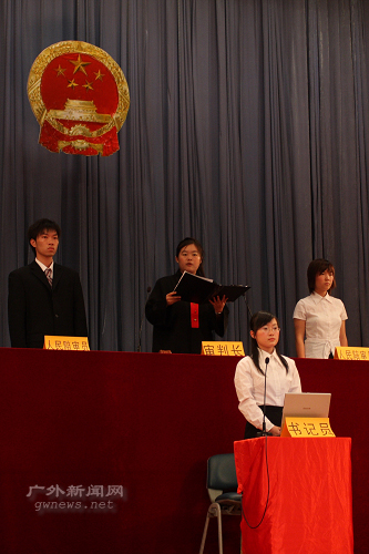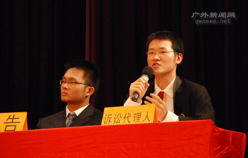 本网讯 5月14日晚,由校党委宣传部和法学院主办的广外大十大精品活动之一——“模拟法庭十周年庆典暨2008年模拟法庭”于南校区B8学术报告厅隆重举行。